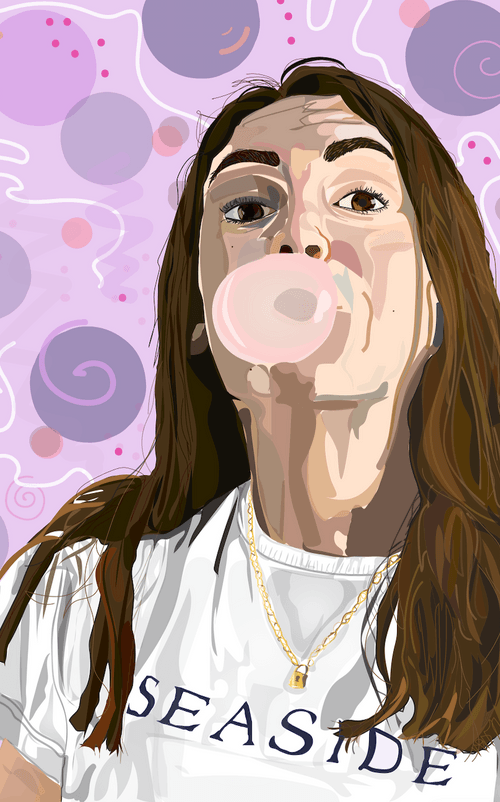 This self-portrait was the first digital drawing I’ve ever done with Adobe Illustrator. This project’s goal was to draw ourselves by representing our personality through the piece. I am a very outgoing and bubbly person so the bubbles, swirls, and bubblegum within my composition express what kind of person I am.