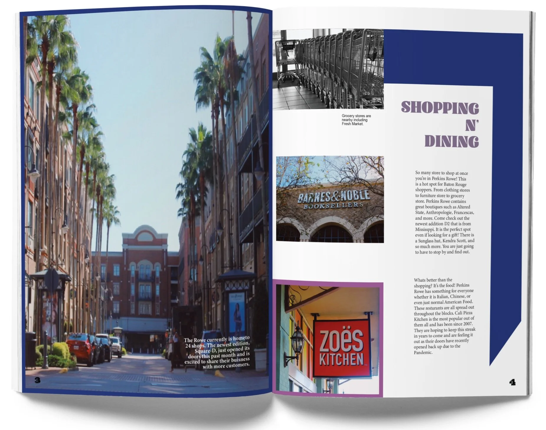 This is a magazine cover and a few spreads from the ARCMAG Fall 2021 addition that focuses on things to do in Baton Rouge post-pandemic. The purpose of the articles is to raise awareness of places that were affected during the pandemic in hopes of bringing them back to life. The magazine is targeted to anyone living or visiting the Baton Rouge area. The spreads highlight the Perkins Rowe shopping district and the shops, eating, and entertainment it brings to family and friends. This project highlights my photography as all the images on the cover and spreads were taken by me. All of the text within the article is written by me as well.