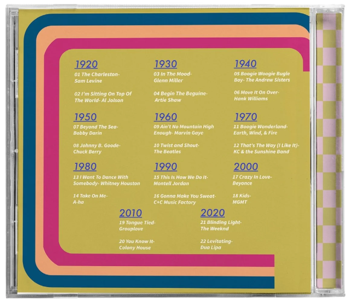 The goal of CD is to supply a track list of songs for people of all ages to put them in a good mood and create a feeling of happiness. Happy music improves life and benefits a person’s mental health. These songs will help benefit people's lives for the greater good as well as create a nostalgic feeling that will send them back in time to a joyful memory. The CD will bring everyone who listens together to one core idea that everyone wants, happiness. The playlist will show everyone how music evolves over time but the one idea that doesn’t go out of style and is still being expressed the same way through music over a century is happiness. The main intent is for the audience to almost feel like they are living in a timeless moment while listening to these songs. This playlist will be relatable and aimed towards all people, with no limit of age, due to the variety of music it will contain. The playlist will deliver 100 years of music, from 1920 to 2020, so it will reach a broad range of audiences.